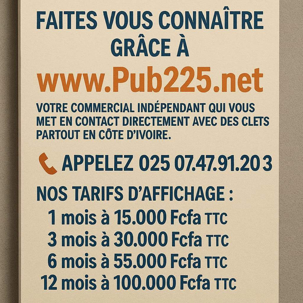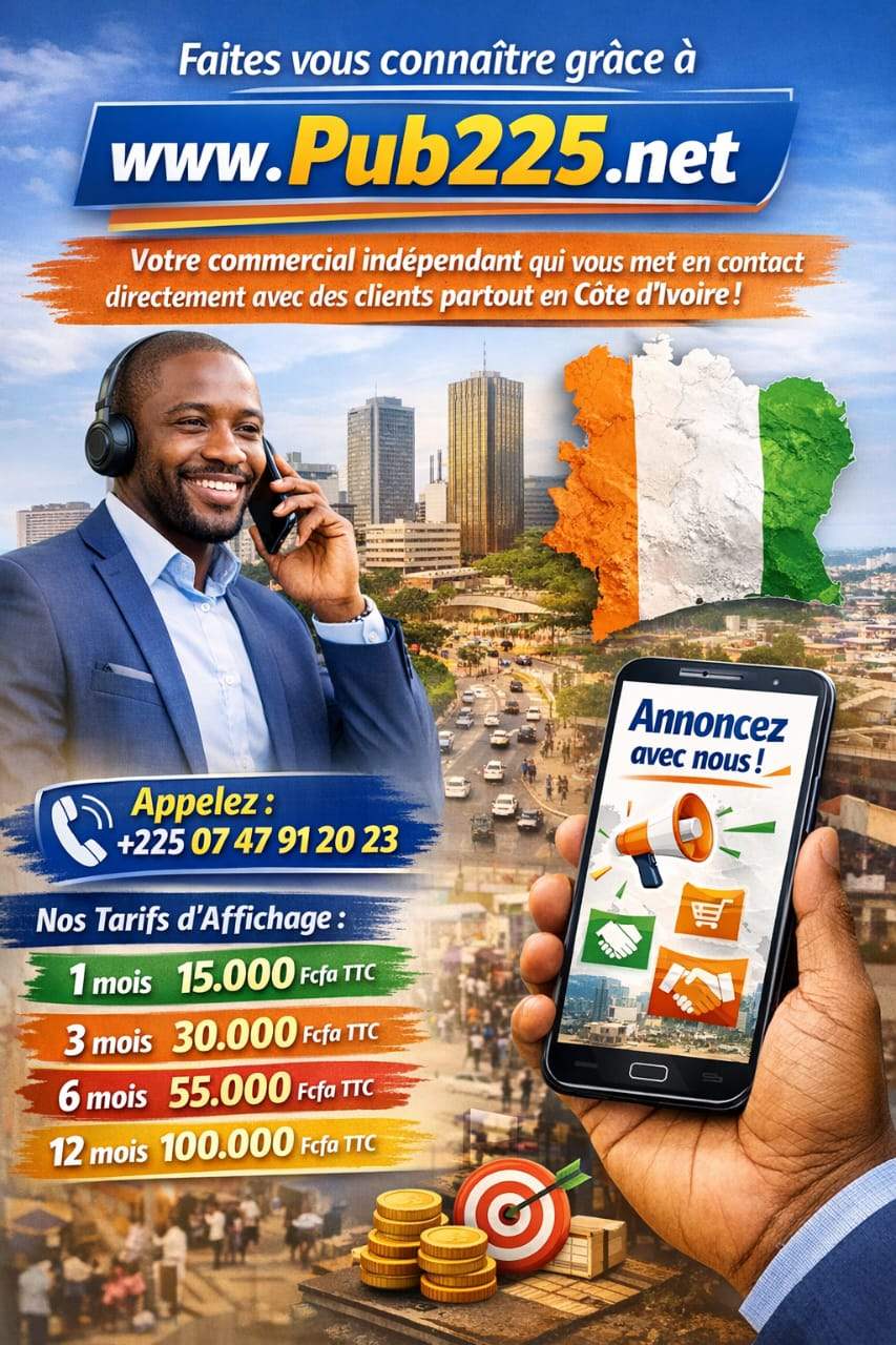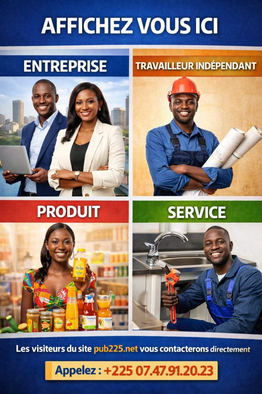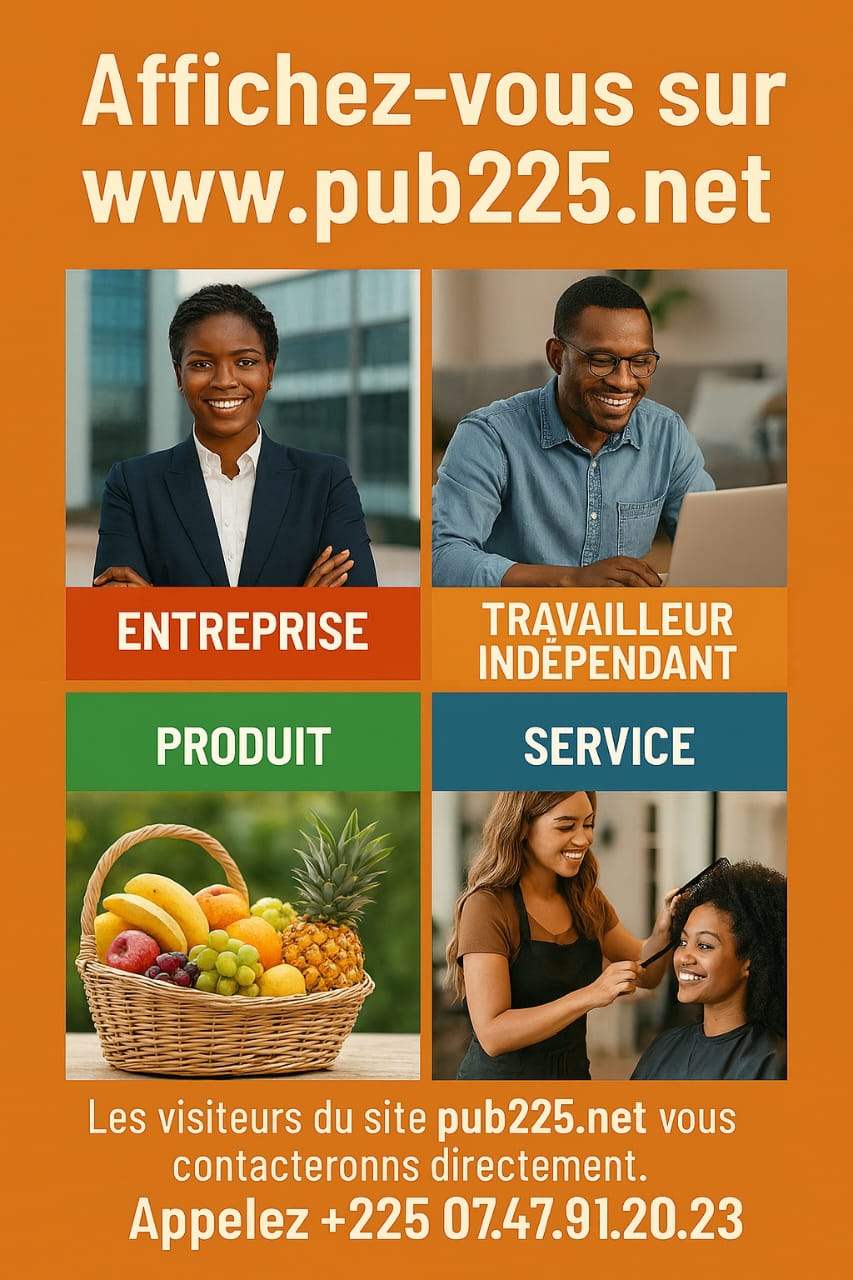 NB : pub225.net n’est pas garant de la moralité des annonceurs ni de celle des clients. Les deux parties sont invitées à faire preuve de vigilance dans leurs échanges et transactions commerciales.